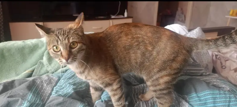 Зеленые глаза, черепаховый окрас, крупная, но не толстая, очень ласковая и контактная, чистая, явно домашняя, лоток знает, кормушки тоже. Характер доминантный. Не пугливая. Сбежала из дома, ловили два раза, сейчас в подъезде, подкармливаем