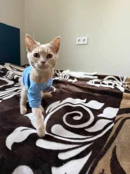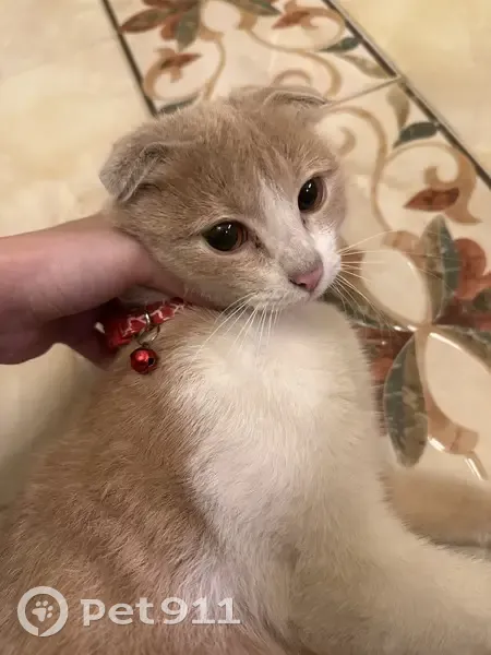 Рыже-белый британский вислоухий кот в красном ошейнике с бубенчиком, явно местный и домашний. Был найден 6.02.26 во дворе дома Петергофское ш 45. В 20:00, придержан до поиска прежних хозяев.