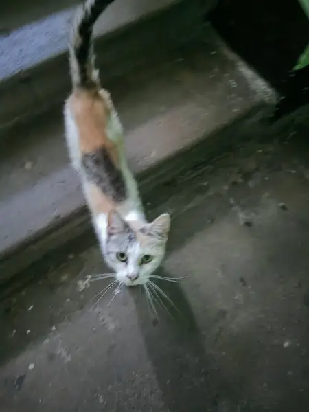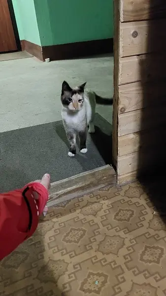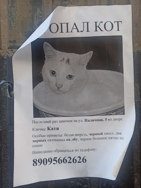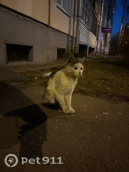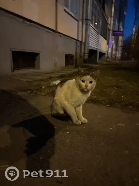Белая, коричневая спинка, хвост и половина головы. Выразительные глаза. Ходила от парадной к парадной. Бежала за мной от двери до машины и обратно. На «кс-кс» отзывалась и подбегала. Но растерянная немного. Возможно чья-то кошка из домов пр. Науки 63, 65, 67, Карпинского 18, 11к1