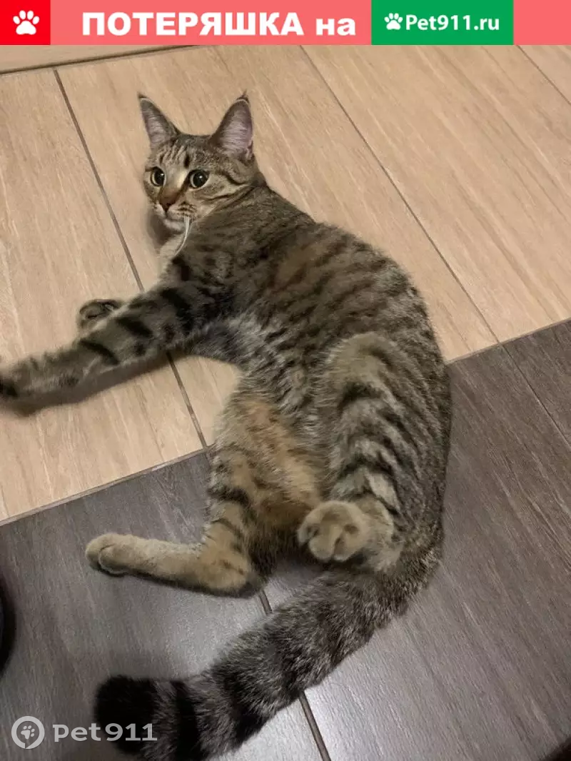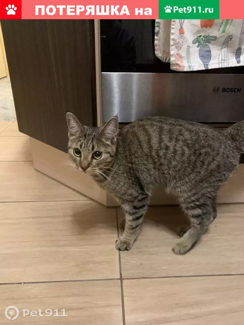 НАЙДЕНА КОШКА во дворе по адресу Рыбацкий проспект 15. Громко и жалобно мяучила, была испугана, возможно выпала из окна, но травм нет. Окрас коричнево-оливковый в черную полоску, короткошерстная, глаза желто-зеленые, небольшая по размеру. Кожа на лапках черная, маленькие черные кисточки на ушах. Молодая (около полугода на вид), явно домашняя, чистенькая. Очень ласковая, ручная, общительная, все время мурлыкает, ходит в лоток.