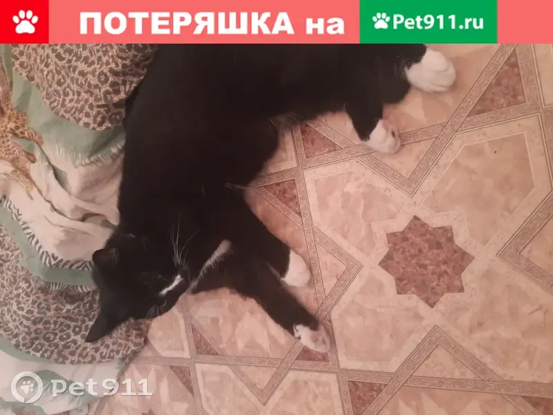 Найдена кошка. Чёрная с белыми пятнами. Похоже,что выпала из окна. Повреждена задняя лапа.