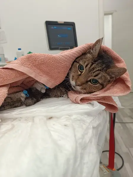 Кошка лежала на газоне, под окнами жилого дома. Когда пошёл дождь, она попыталась встать и уйти. Не смогла, и легла обратно на газон.Но когда принесли переноску ,кошка очень спокойно зашла сама в неё, легла и уснула. Сейчас находится в клинике на лечении.