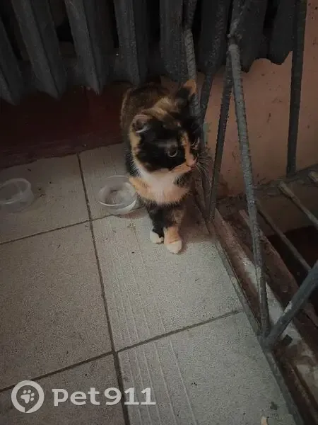 Найдена кошка, трёхцветная, глаза желчные, явно домашняя, очень ласковая и даётся на руки, сама по себе некрупная, скорее всего взрослая, сейчас обитает в парадной