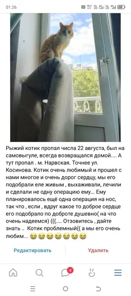 Рыжая пушистая кошечка, пугливая, грудка и "носочки" белые, замечена в Адмиралтейском р-не, г. СПб, во дворе, на ул.Серпуховской, 44. Гладить сразу себя не дала, пугливая очень, -не удалось забрать домой, т. К. Выскочила из рук и убежала на ул. Рузовской. На ней точно был ошейник, тёмного цвета. По нашему району никто, пока, не отозвался, что терял такую кису. Поэтому, не известно, сколько времени она у нас скитается и где сейчас. Но, в любом случае, если хозяин узнает свою беглянку, то есть большая вероятность её найти, подключив к поиску неравнодушных граждан.