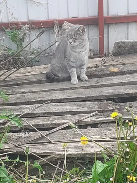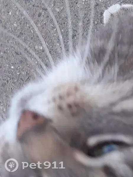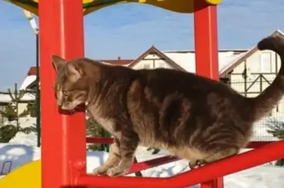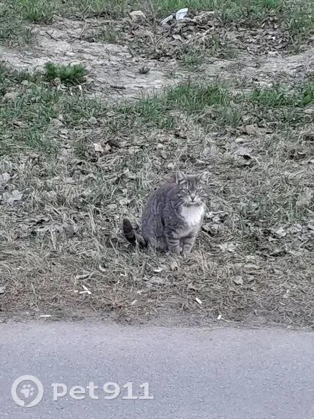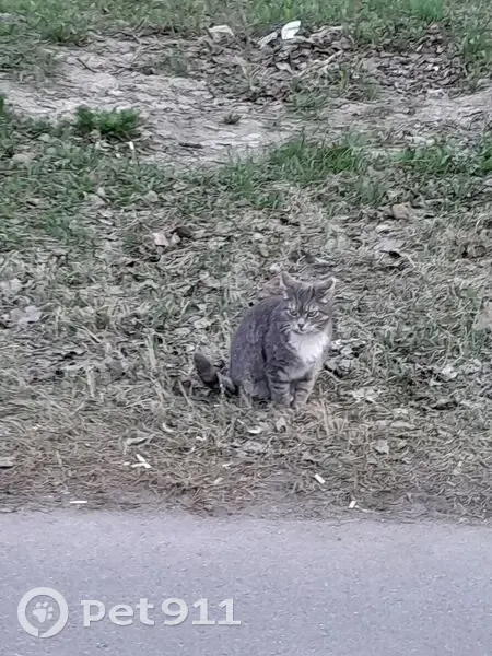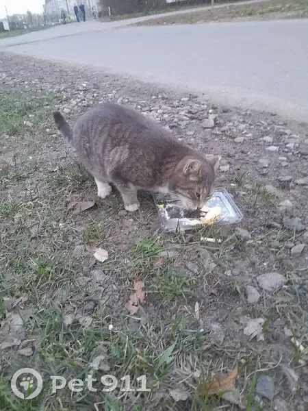Серый в полоску. Белая грудка, немного белого на носочки лапок. Похож на домашнего, ластится, но боязливый. Всё время сидел на одном месте. Размер некрупный. На руки не пошёл. Если кот на самовыгуле, просьба отозваться