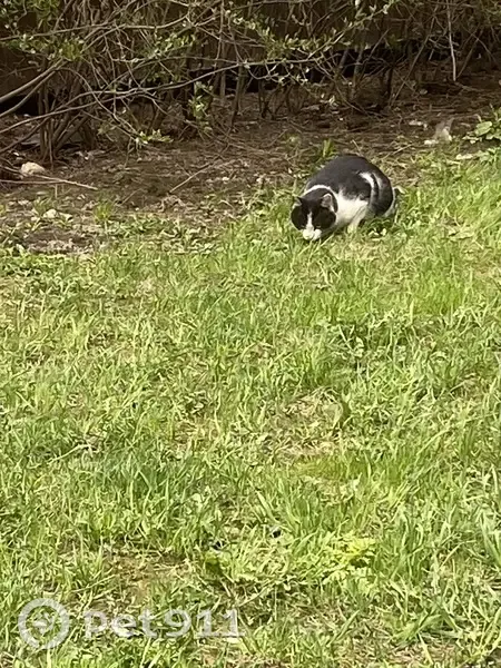 Черно-белая кошка, либо кот, ходит в районе ул. Плесецкая д.16, второй день видим возле мусорных баков, приходит и уходит, очень шугливая, не подходит, оставляли поесть, аппетит хороший, видно что очень голодная, шерстка тусклая скорей всего потерялась уже давно