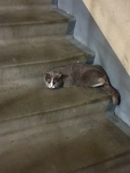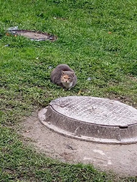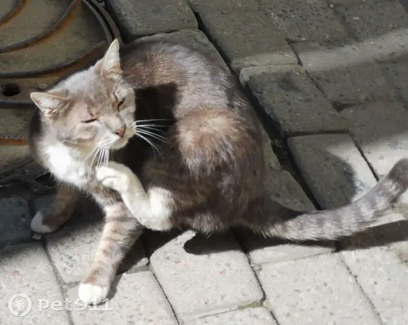 Во дворе дома замечен кот, с виду домашний, в простом чёрном пластиковом ошейнике. Окрас серо-коричневый полосатый (не ярко выраженный), грудь и концы лап белые. Не пугливый, поселился в подвале. Впервые появился ориентировочно 4 мая. Коту оказывается посильная помощь с пропитанием.
