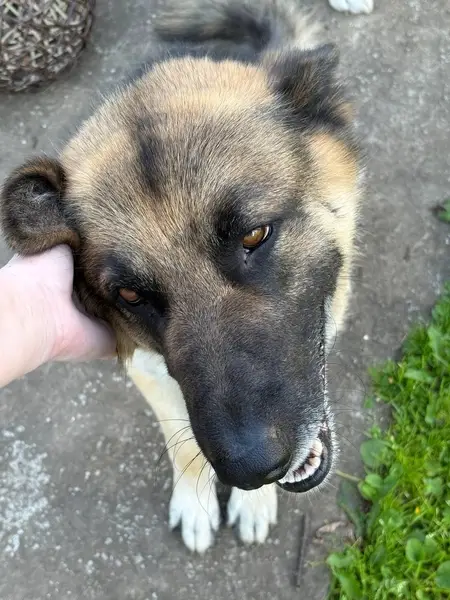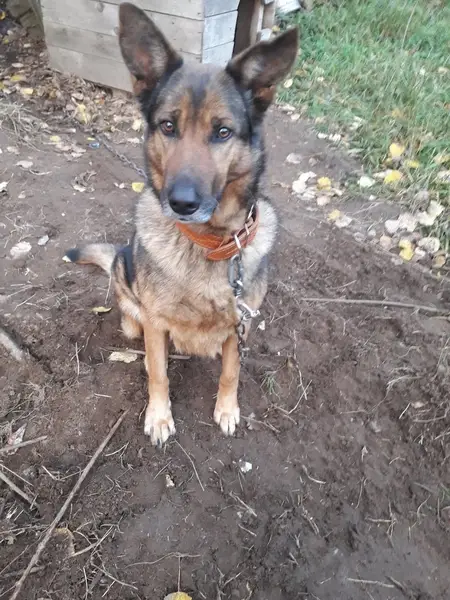 Метис немецкой овчарки, кабель, возраст примерно 8 месяцев, не кастрирован, без чипа, вес 28 кг, сводили к ветеринару, зубы хорошие, проглистогонен. Пес ласковый, не лает, на прогулке ведет себя спокойно. К выгулу приучен, в доме не гадит. Сейчас находится на передержке. Найден в районе станции Обводный канал.