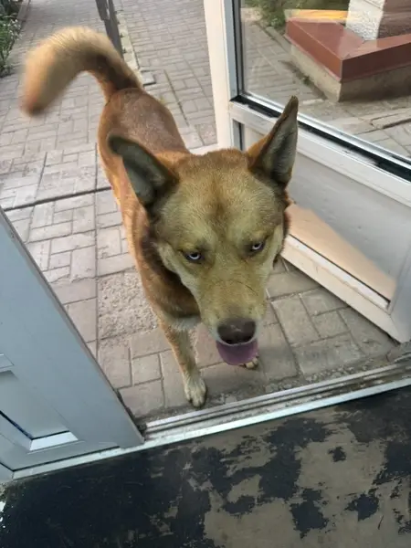 Рыжий окрас, голубые глаза, коричневый нос. Очень ласковый и добрый пес. Имеется след на шерсти от ошейника, скорее всего домашний. В каждом прохожем ищет своего хозяина…