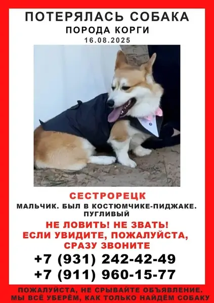 Найден в 8:40 утра, на улице Лазо у дома пр. Ударников, 52к2, кобель породы чихуахуа, гладкошёрстный, кастрированный, видно в возврасте, очень послушный, радостный пёс, на собаке нет ошейника, окрас рыжий с белой грудкой и на кончиках лап белые пятна. Собаку уже теряли и нашли в июле 2025г., в объявлении тогда было указано очень страдают дети, ул. Коммуны 47, телефон хозяина скрыт. Просьба помочь найти хозяина и позвонить по тел. +7 911 177-67-90