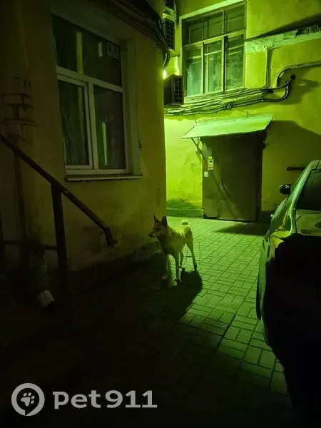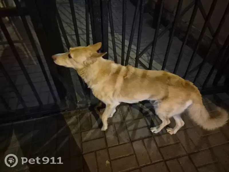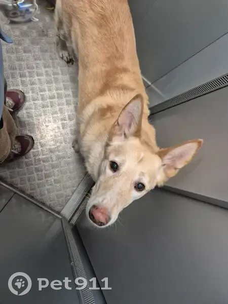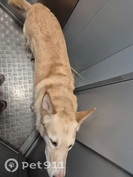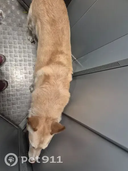 средне-крупная светлая рыжеватая собака, была одна, подбежала к арке во двор, хотела зайти, во дворе подбежала к третьему подъезду, внутри хотела зайти в лифт, из лифта вышла только на четвёртом этаже, подходила к двадцать первой квартире. Довольно спокойная, почти не пугливая, не агрессивная. На этаже ждала кого-то из лифта, потом немного лаяла. Кто-то из подъезда сказал, что это чья-то местная собака и всегда ходит сама по себе