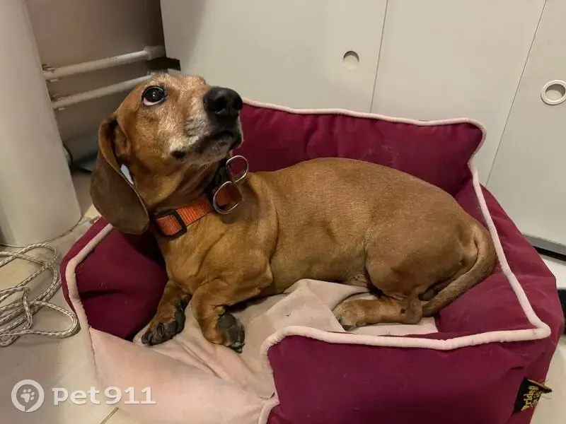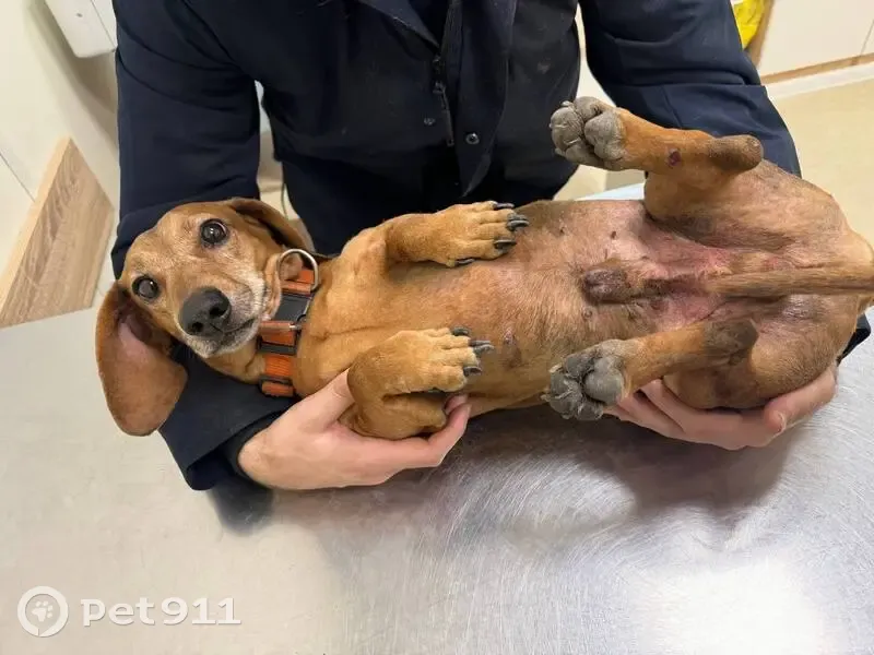 06.12.25 около Ленты на ул. Парашютная 61к4 был сбит пес — такса. На вид лет 8, с ошейником, узи показало, что он был накормлен (т. Е возможно в тот же день и потерялся), Нет агрессии, весит 9,6кг. Хозяина на месте не было, в ленте тоже. Отвезли в вет. Клинику, у собаки вывих-перелом плюсно-заплюсневого сустава. Сейчас собаку взяли к себе домой, в надежде найти хозяина.