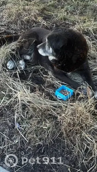 Собака крупная, черная, похожа на помесь ретривера лабрадора или сенбернара. Скорее всего пожилая, не худая, мордочка седая. Ходит плохо, не убегает, но и не подходит.