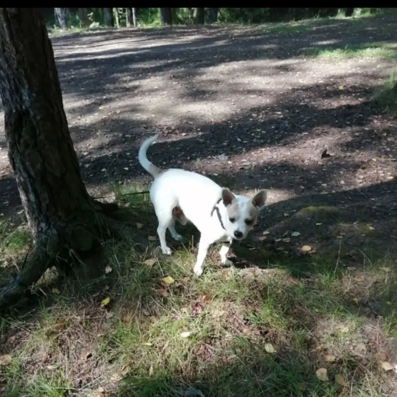Белый пёс с коротким хвостом, с рыжими пятнами бродит несколько дней в районе ул. Афонская 20 - 24.