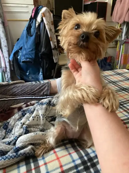 Найден йоркширский терьер. Бежал в СПб по западному скоростном диаметру в районе заезда с набережной Макаров. Мальчик, в курточке серо-коричневого цвета со звёздочками. В возрасте, около 8-9 лет.