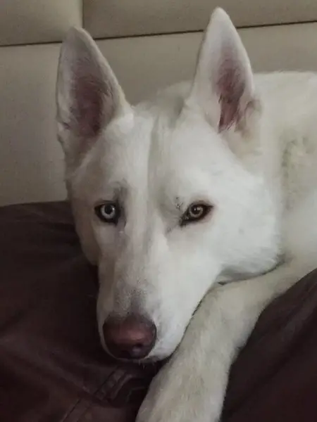 Собака похожа на хаски. Глаза вроде голубые, но один из глаз покрасневший, есть вероятность, что он не голубой. на боку какая то рана, замазанная то ли зеленкой, то ли каким то другим антибактериальным средством. Девочка. Очень нервничает и переживает.