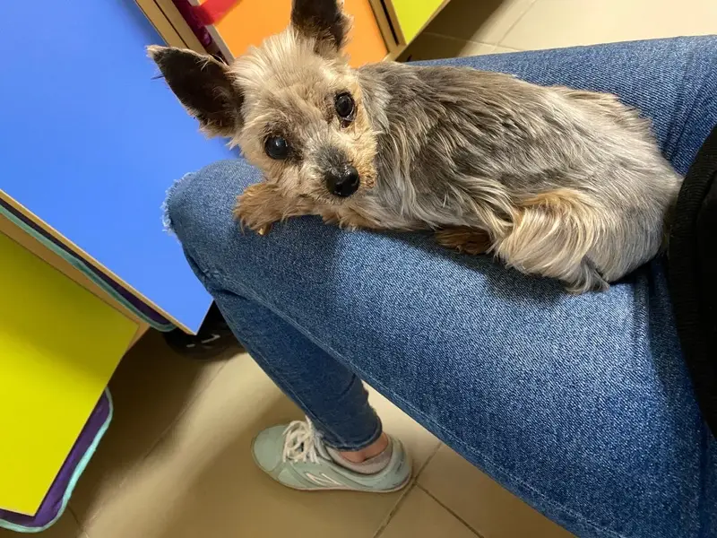 Йокширский терьер,девочка,окрас розовое золото,спинка-тёмная,в возрасте,упитанная,лапки коротенькие.