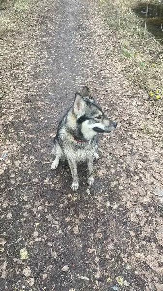 Пес похож на хаски. Окрас темно-серый. Вчера с 11 утра бегал по нашему району, вечером обнаружили его у дома. Пес был без ошейника, выбегал на дорогу с машинами, поэтому мы его придержали у себя.