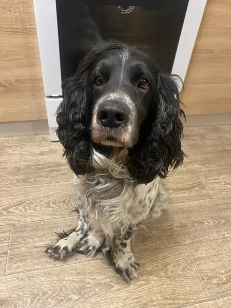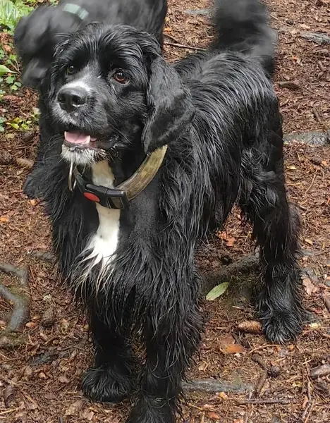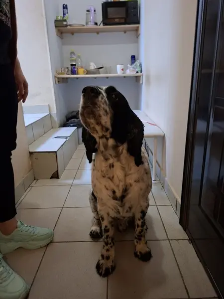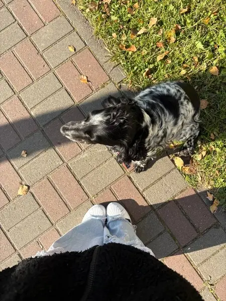 Кобель спаниеля, не щенок. Окрас преимущественно черный с белыми пятнами и участками. Довольно взрослый. Размер средний, по колено. Бегал по Катькиному саду без ошейника, гонялся за птицами и прибивался к ногам людей Ласковый, спокойно ведет себя с человеком и сидит в ногах, видно, что домашний