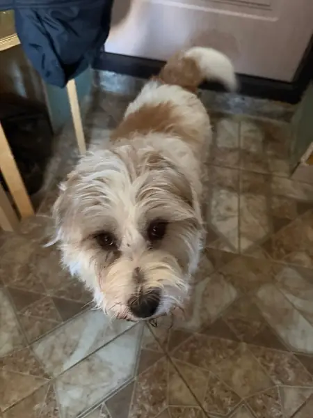 Йорк ухоженный, метки и клейма нету, белый шорстка тятично тёмные пряди и тёмные точки на теле. Ехал с работы вижу что то белое бежит по дороги и прыгает под колеса автомобиля ведущего впереди меня. Подобрав был в шоке на прямых лапах, весь дражал и не двигался вообще, спустя пару часов очухался и был на на первичном осмотре и проверке на наличии метки.