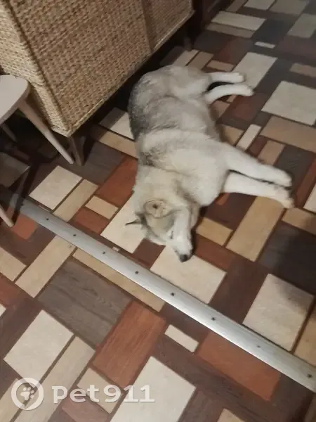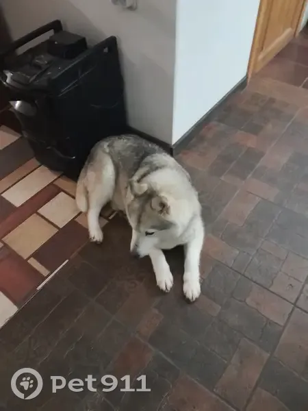 Собака,породы хаски. С ошейником, оборван поводок, на обрывке поводка большой кусок наледи. Голодная,но ухоженная,домашняя. Похоже,бегает пару дней.Пришла на проходную завода, людей не боится,но уставшая.