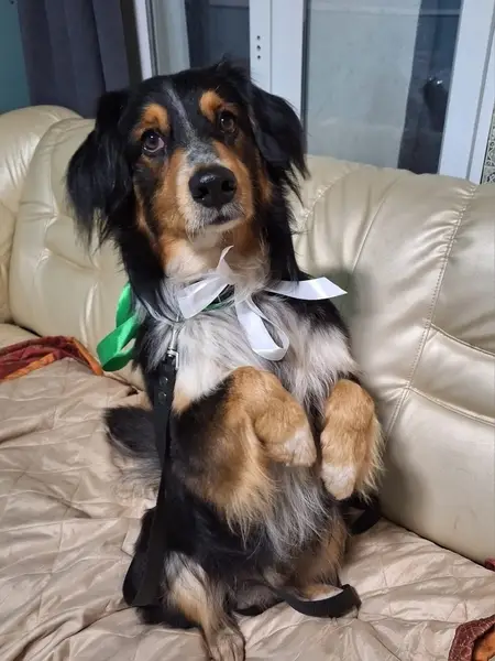 Девочка ухоженная,зубки белые,чистые,блох нет,ушки тоже чистые. Очень добрая,немного пугливая. На вид 1,5-2 года. Знает Команды сидеть и дай лапу. Был одет матерчатый красный ошейник.