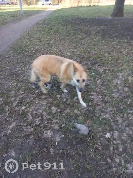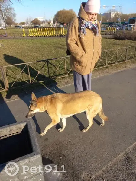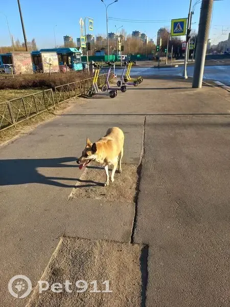 Рыжий окрас, средняя, упитанная, ухоженная. Бежала со стороны моста Кораблестроителей. Была сильно растеряна, но не металась (думала, куда и как идти дальше). Видно было, что местность ей незнакомая. С опаской и нерешительно переходила дорогу. Далее, перейдя пришла на остановку транспорта, ища помощи и поддержки от людей. Прижалась к моей ноге. Собака полностью адекватная и социальная - её любили, ей занимались.