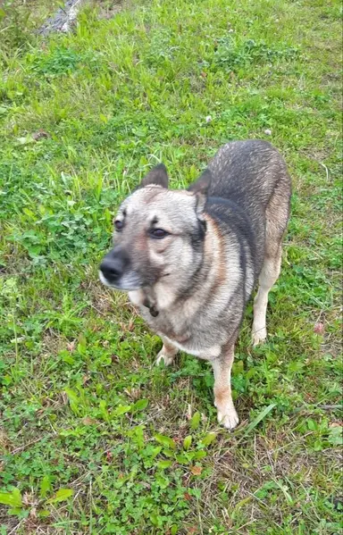 Помесь лайки и овчарки . Хромала . Похоже , только родила и кормила . На вид 1,5 . Понимает команда сидеть и лапу подает . Серо бежевый окрас. Зубы белые . 6 пальцев