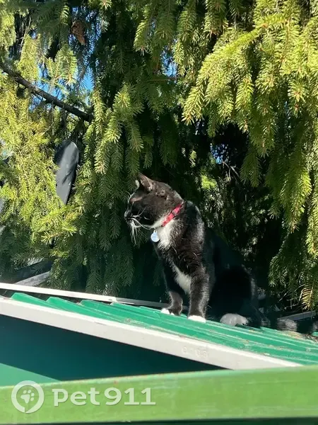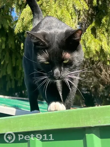 Черный котик с белой грудкой , белыми носочками на лапках , на шее красный ошейник с круглым жетоном . Был выпущен 16.05 утром рано на Ул. Новосельковской , дом 15