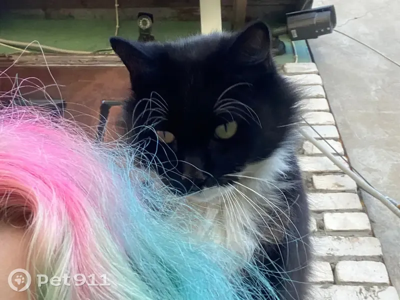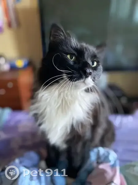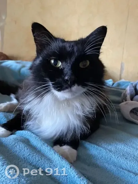 Крупный, пушистый, черно-белый типичный маркиз с белой отметиной на левой губе и зелено-желтыми глазами. Домашний, был на самовыгуле. Мог подойти к людям, не агрессивный. Без адресника.