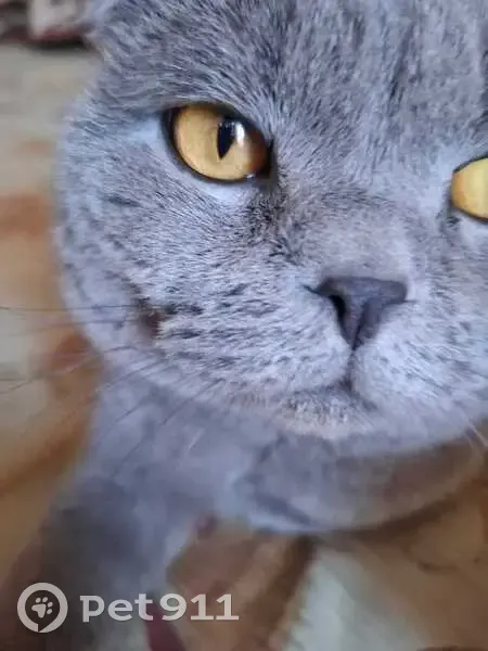 Дымчатого цвета,порода шотландец вислоухий,вышел погулять с ним,сидел на скамейке в телефоне и не заметил как кот вылез из шлейки и удрал,некастрированный ,8 лет дружелюбный, коммуникабельный ,ласковый