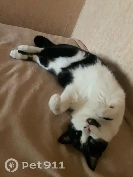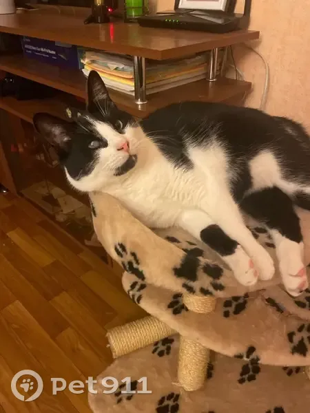 Черно-белый кот с одним слепым глазом. Выбежал из переноски и спрятался во дворе под машиной, после убежал куда-то еще. Скорее всего где-то во вдоре и сидит. Очень грязный из-за пряток под машиной