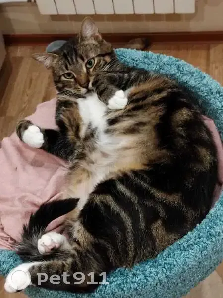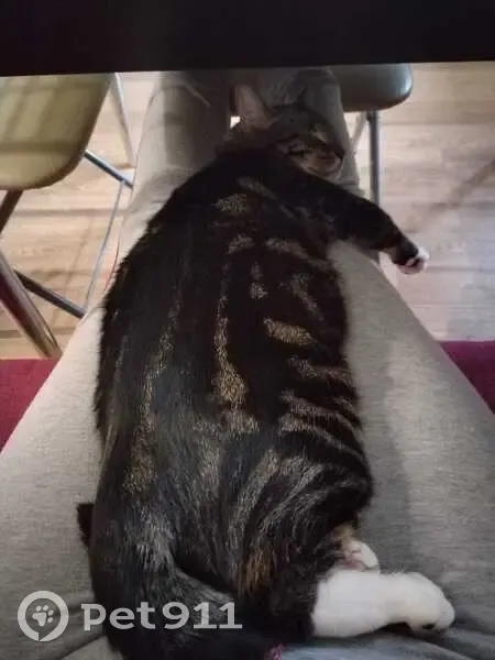 Окрас полосатый ( черепаховый), похож на арбуз. Кот крупный "мощный" и пугливый. Из особенностей: Белый подбородок , белое пятно на шее и белые "носочки" на ножках.