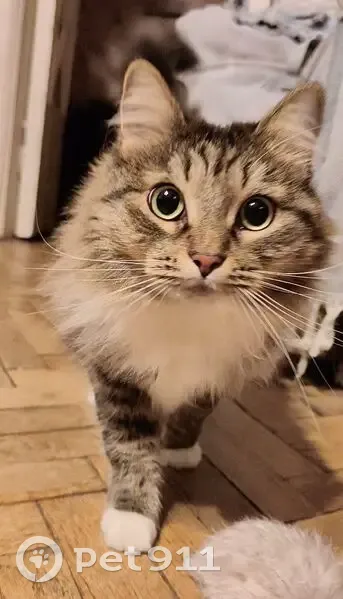 Длинная шерсть, белая грудка, белые "носочки" на лапках, длинный пушистый хвост. Добрая, очень пугливая, улицы не знает. Выпала из окна 3го этажа возле 5го подъезда