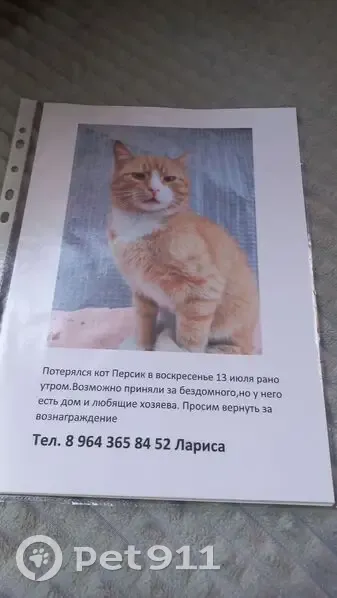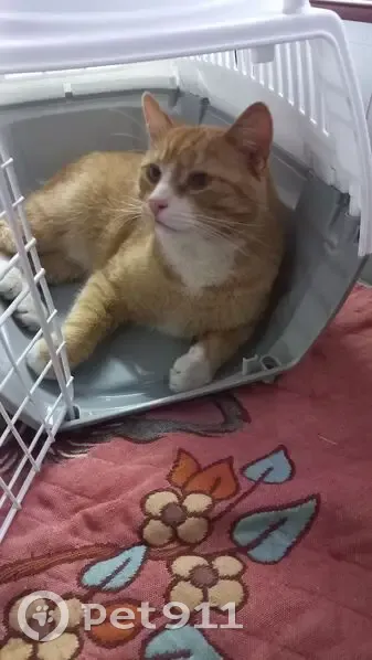 Окрас рыжий , отличительная черта : половина мордочки рыжая , а половина белая , на шее - белая манишка.Очень пугливый , на контакт не идёт,гулял только по ночам.