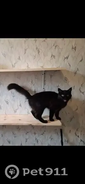 Порода мейн-кун. 8 месяцев по размеру как обычная кошка или чуть крупнее. Окрас черный с едва заметной рыжиной на спине. На передних лапках частично сбрита шерсть. Кличка "Ерсения" Отзывается на кличку и "Кушать"