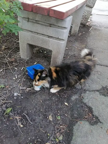 Трехцветная пушиская кошка. Мордочка с одной стороны рыжая с другой рыже- черная. Носит красный ошейник с рисунком глаз.