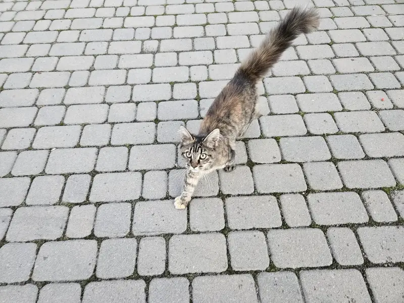 Пушистая как бы в полоску тёмно- серую( тигровая ) 3 года гуляла рядом с домом у балкона, 1-ый этаж , никогда никуда далеко не уходила, немного диковата , чужим в руки не даётся, только своим Возможно, кому-то удалось приманить ( Надеемся, это худшее, что могло случиться Хвост - как у белки