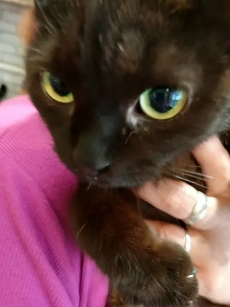 Окрас: черная, с большими желто-зелеными глазами, висит животик Домашняя кошка, пугливая