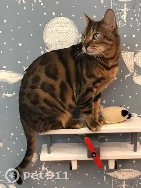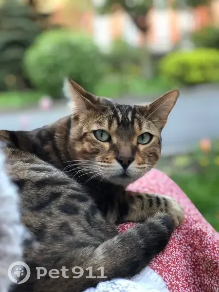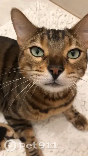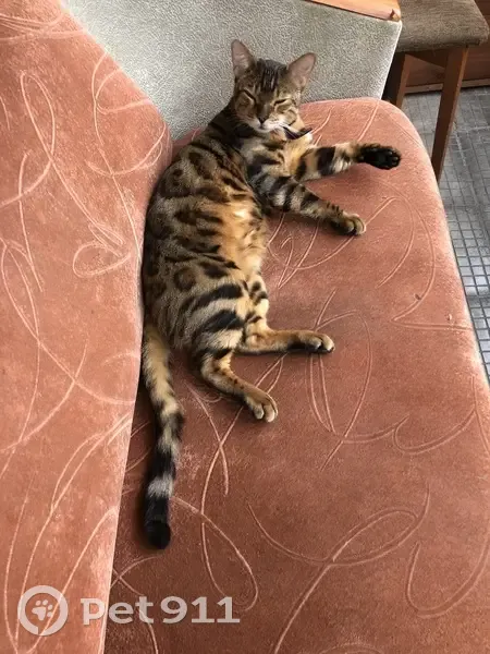 Бенгальский кот. Характерный леопардовый окрас, говорливый, громкий. 9 лет, 8 из них гуляет сам и возвращается домой. На шее кожаный, плетенный косичкой ошейник с адресником. Может подойти дать себя погладить, а может и уйти, испугавшись. Не сильно пуглив, скорее осторожен. Не агрессивен. Очень ждём нашего парня!