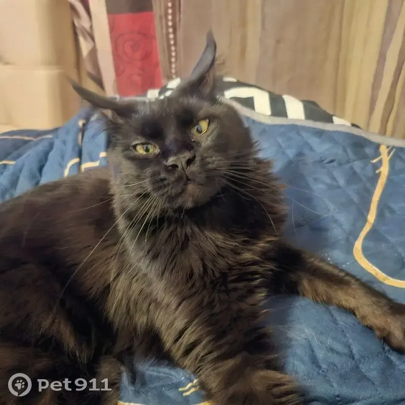 Полностью черная кошка, на ушках небольшие кисточки, жёлтые глаза, большой пушистый хвост, похожа на мейкуна, выбежала из квартиры по адресу Выборгское шоссе д 25