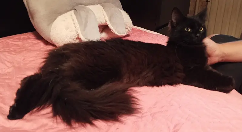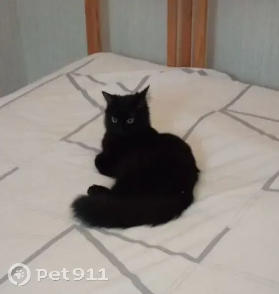 Окрас чёрный. 2 года. Пушистая, особенно хвост. Маленького роста. Пугливая. Выбежала из подъезда. Умная. От страха может не подойти, если позвать по имени