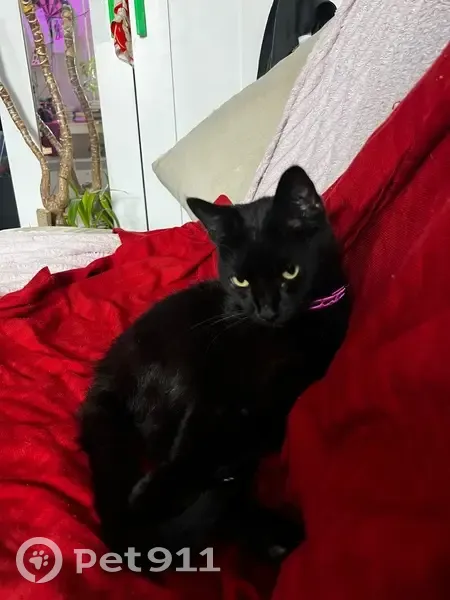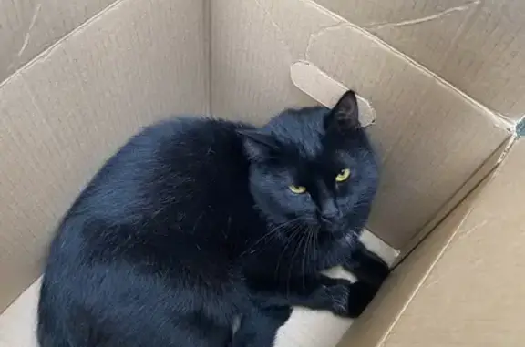 Гулящий кот, но раньше всегда возвращался. На нем был розовый ошейник с колокольчиком. Не боится людей. На груди 3 белых волоска, сам черный с шоколадным переливом.