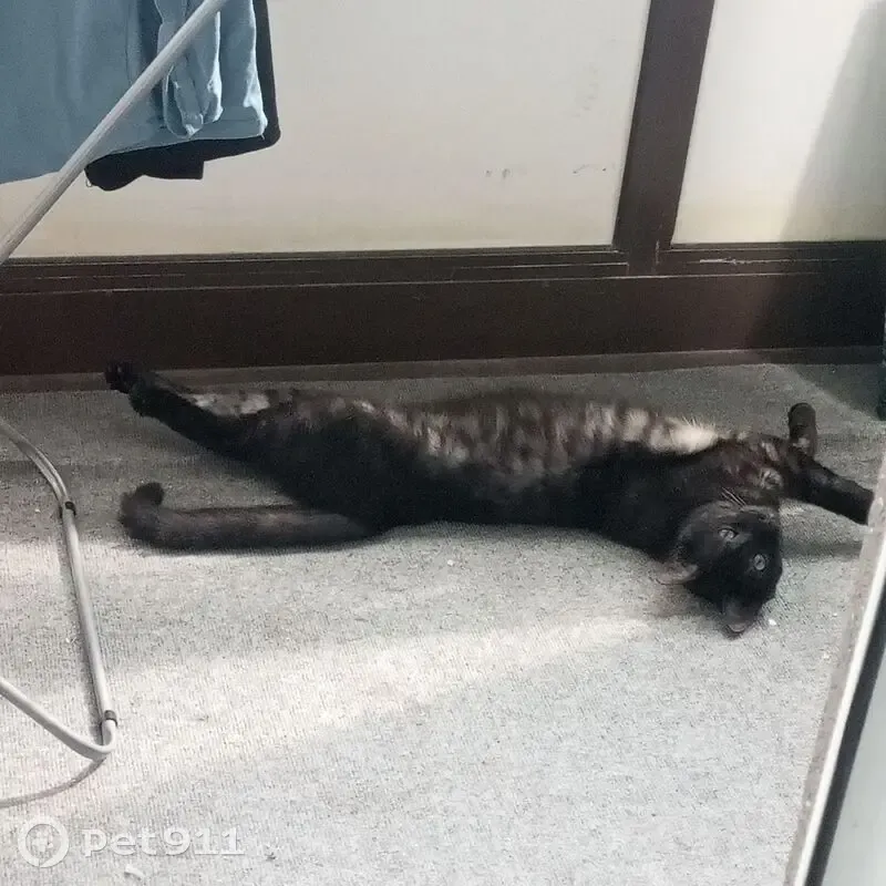 Чуть больше одного года. Тёмно-серый, почти черный, белая грудка, полосатый живот. Неохотно идёт на своё имя. Нечасто мяукает, больше говорит "уррр" (не мурлыкает, а как бы мяукает с закрытым ртом)