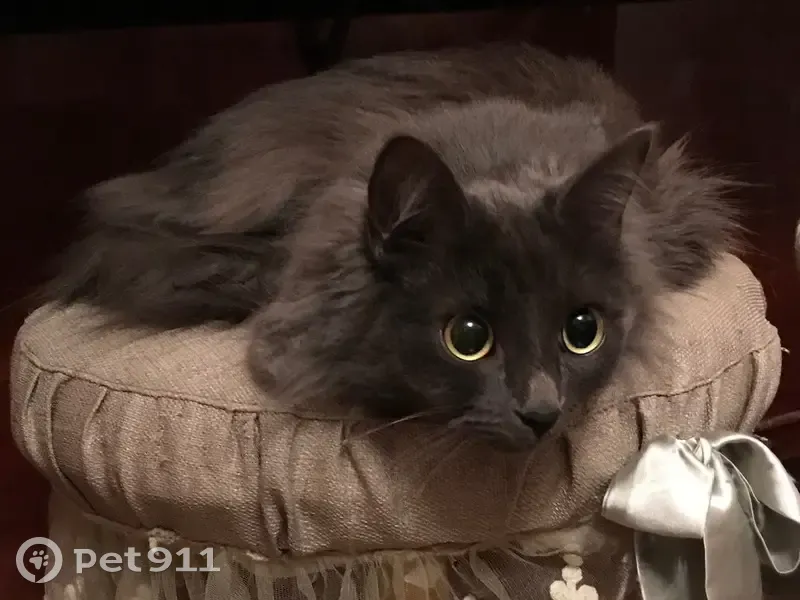 Нибелунг темно- серого цвета, длинношерстная , на шее белая манишка, глаза разного цвета. Выпала с окна, никогда не выходила на улицу , домашняя. Чипированная.
