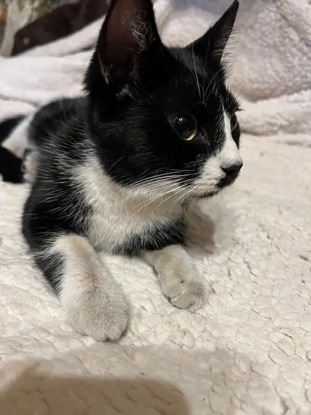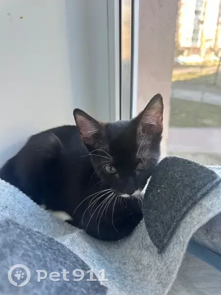 Котик по кличке - Пижон Возраст -10 месяцев Кастрирован Телосложение -худой Длинные лапы и хвост Большие уши Окрас -черный, есть белый воротничок, белые пятна на мордочке и лапках. Выпал из окна