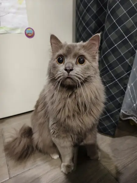 Дымчато серый, пушистый, крупный, одет красный ошейник