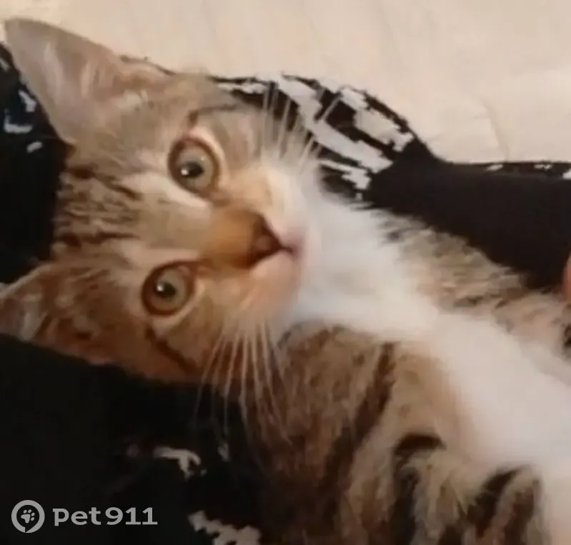 Полосатый, белая грудка и белые лапки, на одной лапке розовая подушечка, карие глазки, возраст около 1,5 годика, пугливый, боится чужих людей, к незнакомым не подходит, может прятаться, домашний, улицы не знает