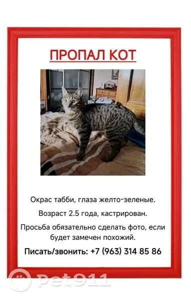 Санкт-Петербург, Красногвардейский район, Индустриальный проспект Потерялся кот 21.12 в районе 16 часов. Окрас табби, глаза желто-зеленые. Ласковый, но боится громких звуков (машин, собак и т. П.) Просьба обязательно сделать фото, если похожий будет замечен. Писать/звонить: +7 963 314 85 86 (Анастасия)