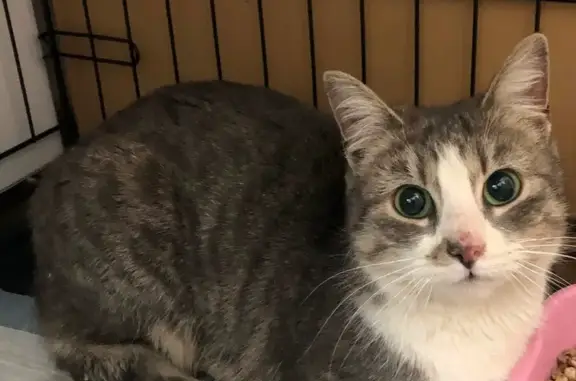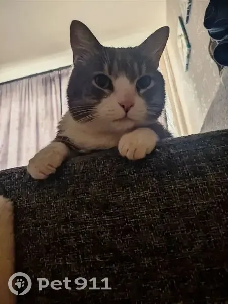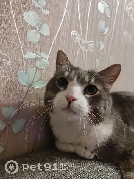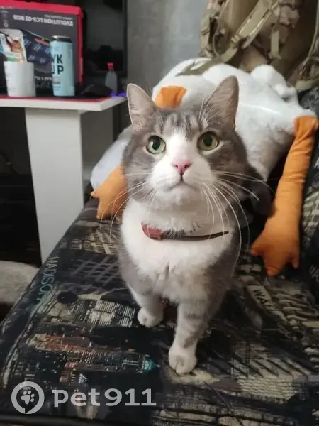 Серо-белый окрас. Спинка ,голова и хвост серые. Лапы, живот и часть мордочки белые. На спинке есть еле заметные тёмно-серые полосы. Кончик хвоста тёмно-серый. Глаза зелёные, нос розовый. Кастрирован. Без ошейника. Длинношерстный.